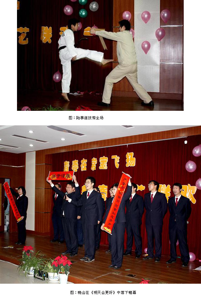 伴隨著一聲“起航了”,“青春在常寶飛揚(yáng)”迎新春聯(lián)歡會在ERW項目組的合唱“眾人劃槳開大船”中拉開序幕,一首首悅耳動聽的歌曲,一句句妙語連珠的話語,一張張充滿青春朝氣的笑臉,組成了一道道亮麗的風(fēng)景線。新進(jìn)大學(xué)生自編自導(dǎo)的三句半《繼往開來說常寶》讓大伙開心不已;裝備部陳娟的一首《一個人的精彩》贏得陣陣熱烈掌聲;相聲《現(xiàn)代版的大話西游》及小品《常寶新聞》詼諧幽默,讓大伙笑的直不起腰;榮獲一等獎的武術(shù)表演《跆拳道》與《雙節(jié)棍》出色的功夫讓大家大開眼界;還有多才多藝的鄭玉平女兒鄭亞南小朋友帶來的二胡獨(dú)奏《蘇北小調(diào)》給我們留下了深刻印象;當(dāng)然也少不了情歌對唱,充滿活力的帥哥彭福本與靚麗文靜的廖濤一曲《你是我心內(nèi)的一首歌》,讓參加聯(lián)歡會的同事們紛紛陶醉。熱烈的氣氛、優(yōu)美的歌聲、歡樂的場面、燦爛的微笑,讓公司員工度過了一個輕松的下午。在外貿(mào)部全體員工《明天會更好》的歌聲和掌聲中,聯(lián)歡會降下帷幕。
