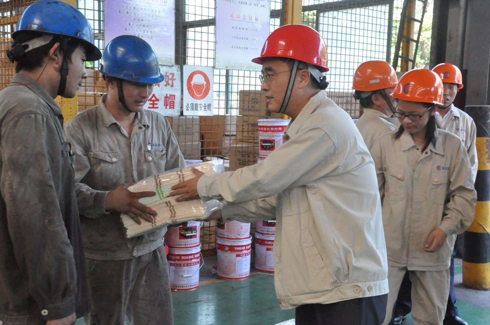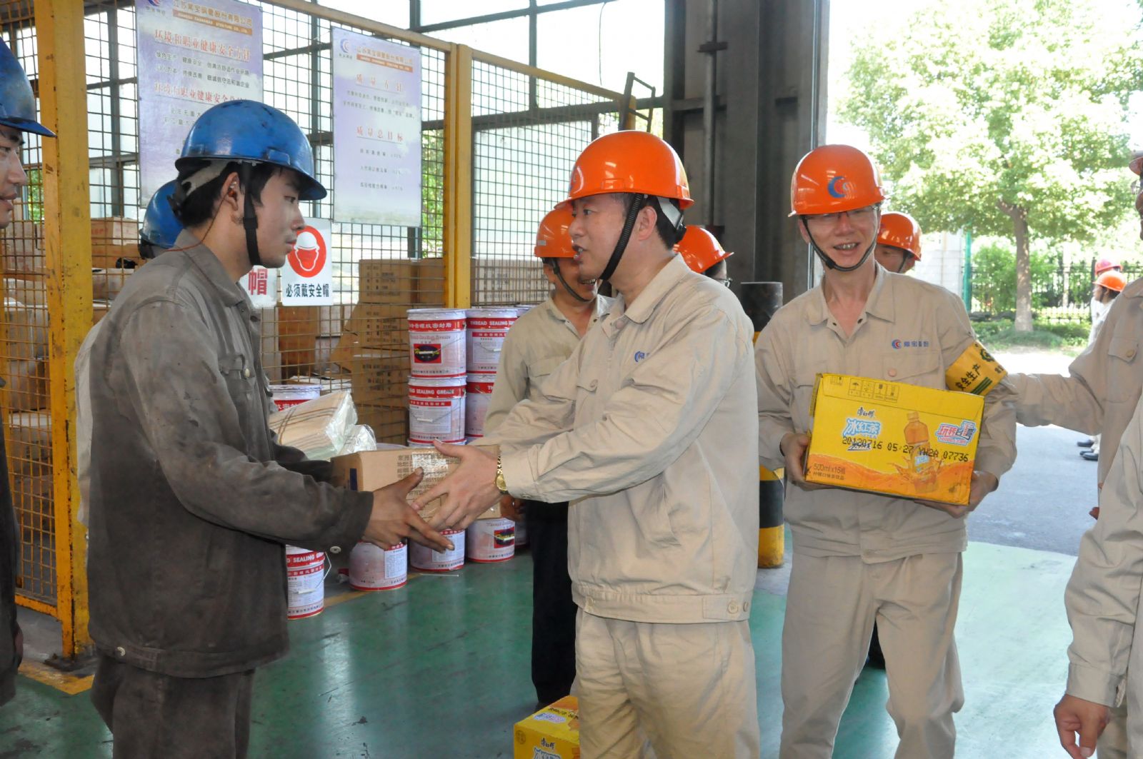 7月26日下午,公司董事長(zhǎng)曹堅(jiān)、總裁朱洪章等公司領(lǐng)導(dǎo)一行10人,頂著烈日高溫深入常寶股份、常寶精特車(chē)間生產(chǎn)現(xiàn)場(chǎng),親切慰問(wèn)奮戰(zhàn)在高溫一線的干部員工,并一一送上冰紅茶、酸梅湯、毛巾等防暑降溫飲品(用品),對(duì)他們堅(jiān)守崗位、為常寶生產(chǎn)經(jīng)營(yíng)的穩(wěn)步增長(zhǎng)和持續(xù)發(fā)展所作出的貢獻(xiàn)表示衷心感謝。