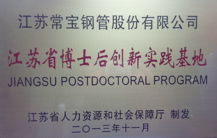 2013年底,省人社廳正式下發(fā)《關(guān)于批準江蘇省檢驗檢疫科學(xué)技術(shù)研究院等70個單位設(shè)立江蘇省博士后創(chuàng)新實踐基地的通知》(蘇人社發(fā)[2013]382號),江蘇常寶鋼管股份有限公司申報的江蘇省博士后創(chuàng)新實踐基地正式獲批設(shè)立。