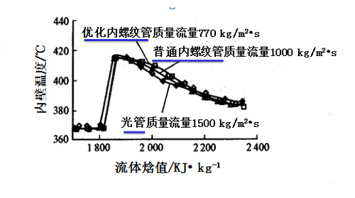 優(yōu)化內(nèi)螺紋管是在傳統(tǒng)內(nèi)螺紋管基礎(chǔ)上進(jìn)一步發(fā)展起來(lái)的新一代內(nèi)螺紋管,其螺紋升角達(dá)到40°多,相比普通內(nèi)螺紋管,又能提高20%的傳熱效率,因此與傳統(tǒng)的內(nèi)螺紋管相比,其具有更佳的傳熱效應(yīng);下圖為光管、普通內(nèi)螺紋管、優(yōu)化內(nèi)螺紋管傳熱特性